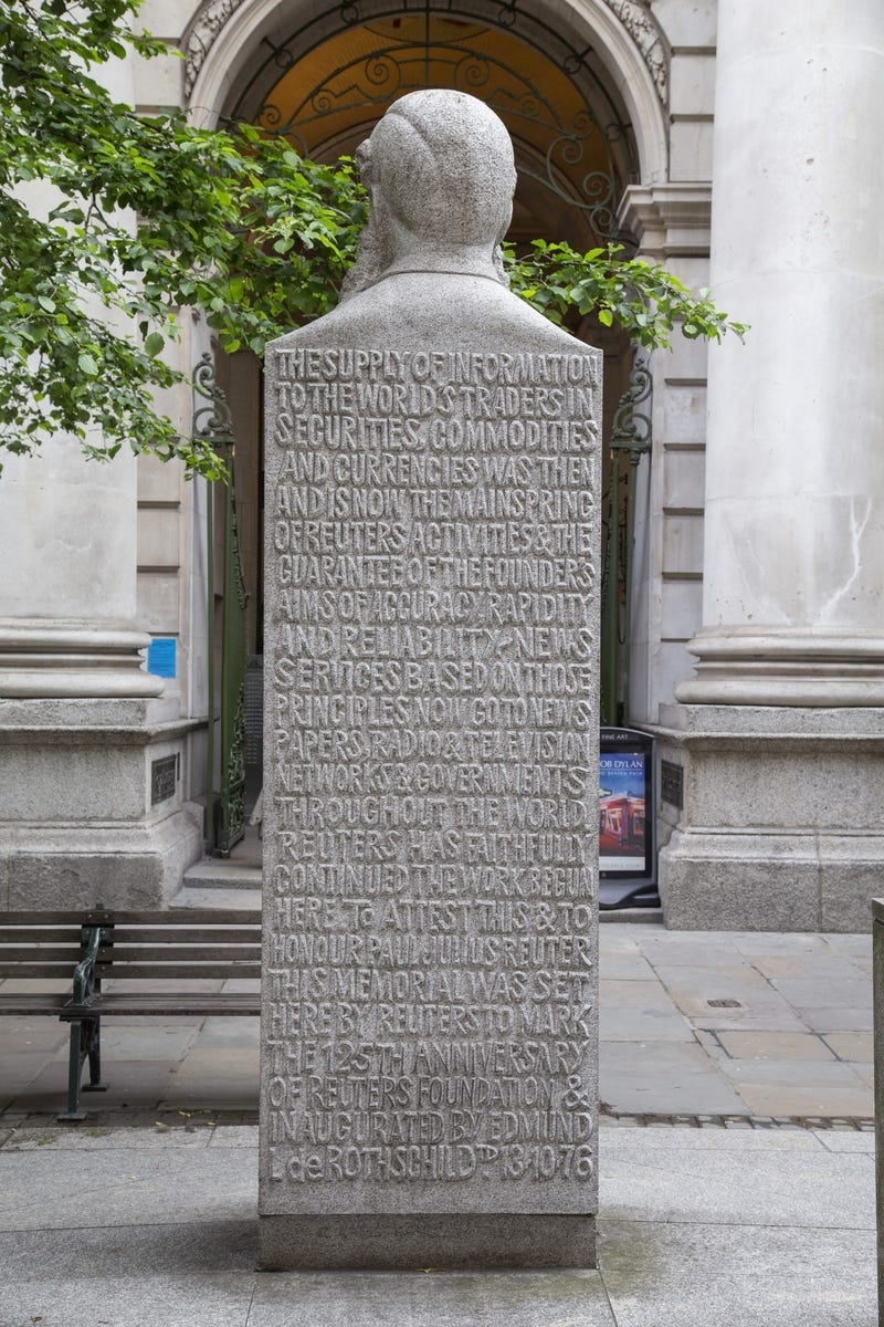 FOUNDED THE WORLD NEWS ORGANISATION THAT BEARS HIS NAME IN NO. 1 ROYAL EXCHANGE BUILDINGS IN THE CITY OF LONDON, NEAR THIS SITE, ON 14 OCTOBER 1851.